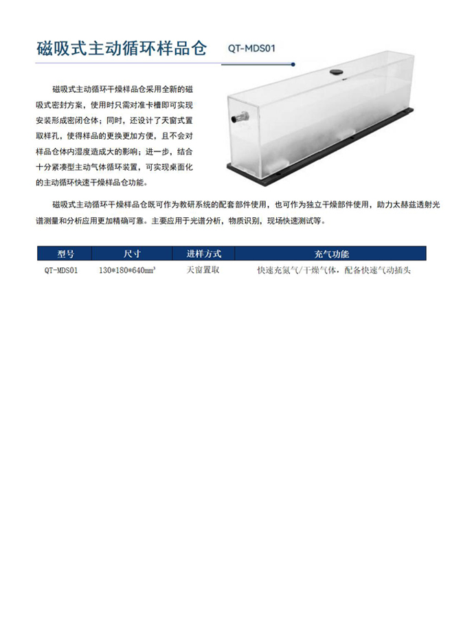 磁吸式主動循環(huán)干燥樣品倉既可作為教研系統(tǒng)的配套部件使用,也可作為獨(dú)立干燥部件使用,助力太赫茲透射光譜測量和分析應(yīng)用更加精確可靠。主要應(yīng)用于光譜分析,物質(zhì)識別,現(xiàn)場快速測試等。